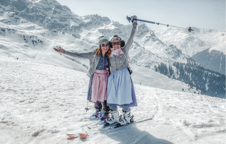 Thema im Montafon: Dirndl im Firn. Wer will kann seine Dracht zum Skifahren anziehen!